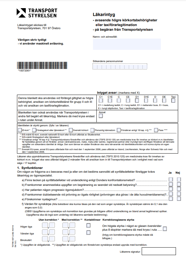 Hos oss får du en läkarundersökning samt syntest. Informationen sammanställs för läkarintyget avseende följande: